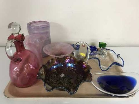 A tray of cranberry glass decanter with stopper, carnival glass, assorted glass vases, bowls, eye baths etc