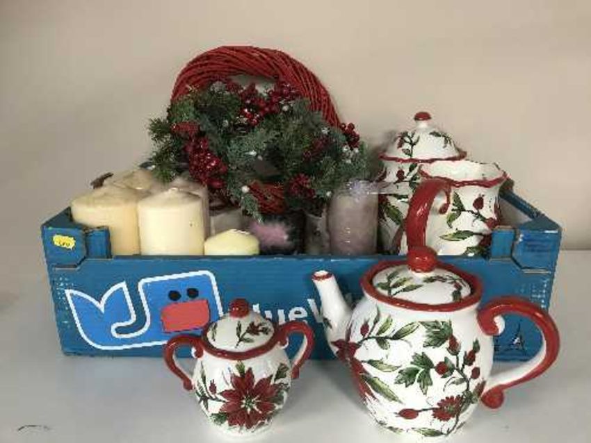 Two boxes of picture frames, candles, Christmas wreath, china etc