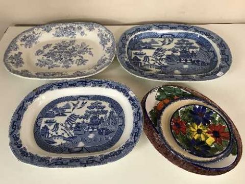 Three antique blue and white meat plates, collection of dinner plates, boxed Sadler teapot, etc