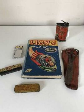 A can of Superior "Specially Prepared Lubricating Oil for Cycles", together with a "Dunlop Long Cycle Repair Outfit" (tin only), a "Britfix Cycle Repair Outfit" (tin only), a "Belvin Cycle Puncture Outfit", a Lion 1957 Annual and a pair of antique scissors (in red sleeve). (6)