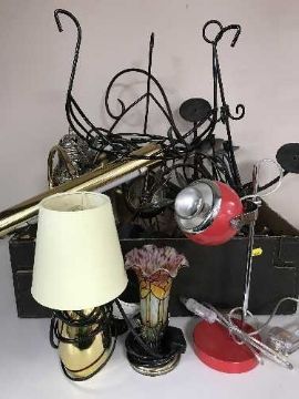 Two boxes of desk lamp, assorted table lamps, Tiffany style lamp, candle holders etc