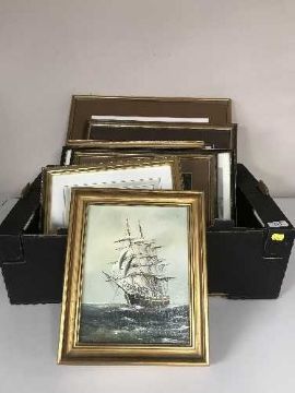 A basket of pictures and prints inc. framed signed print of Durham Cathedral by Jan Dawson, pair of John Hogarth Blaydon Races prints etc