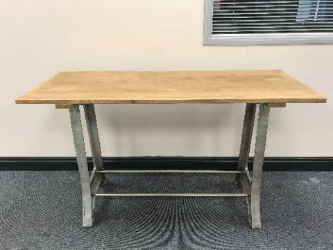 A reclaimed pine table on cast metal supports