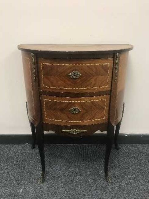 An inlaid walnut d-shaped two drawer chest