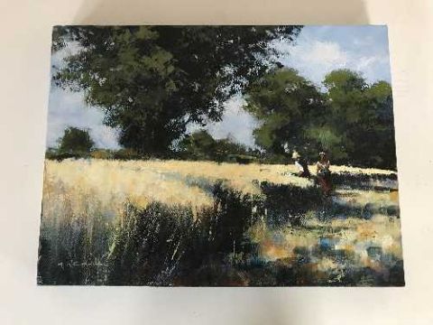Maurice W. Crayshaw : Figures scything in a wheat field, acrylic on canvas
