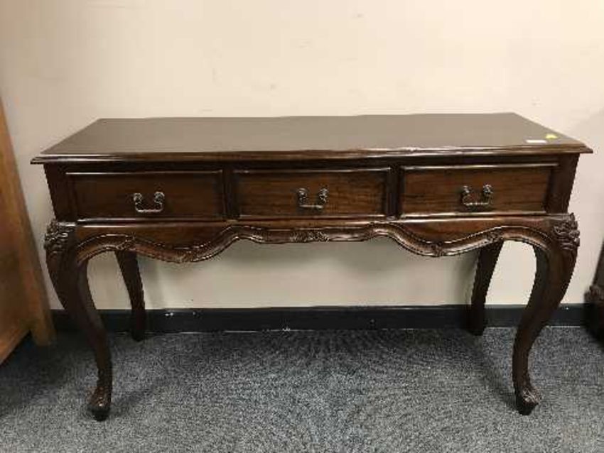 A reproduction mahogany three drawer side table