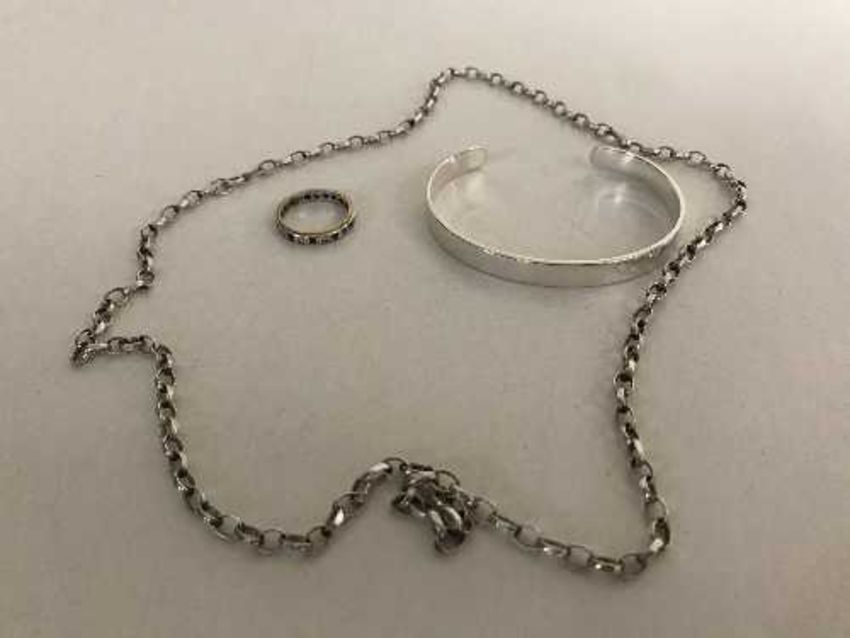 Four items of silver jewellery to include bangle, tie clip etc, together with a 9ct gold CZ and sapphire eternity ring
