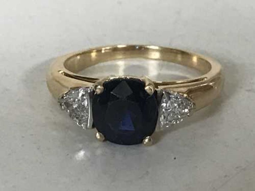 An 18ct gold sapphire and diamond ring, the cushion-cut sapphire within a four claw setting flanked by two trilliant-cut diamonds