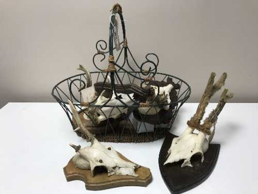 A basket of six deer skulls mounted on plaques