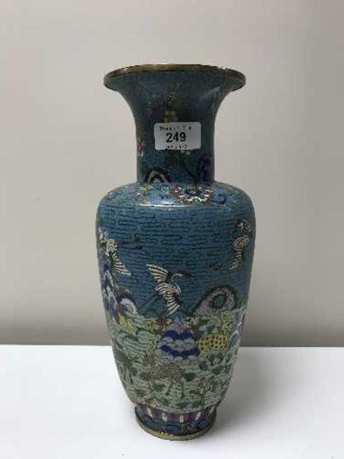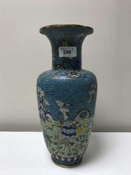 A large cloisonne vase depicting storks in flight