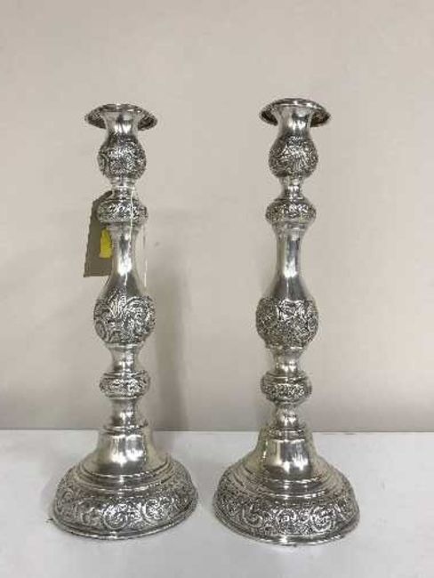 A pair of sterling silver embossed candlesticks, bearing London hallmarks, dated 1921, height 29.5cm