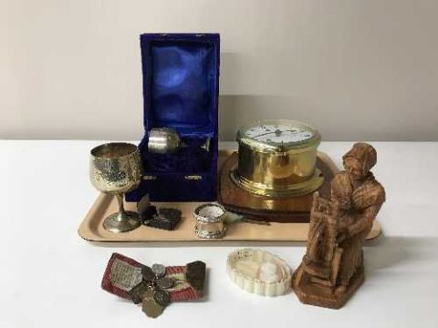 A circular brass ships clock mounted on board, a pair of cased goblets, religious pendant etc