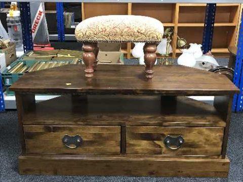 A contemporary Laura Ashley television stand fitted two drawers, together with a foot stool