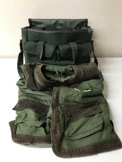 A Wychwood fishing bag of four Rimfly reels, wax jacket and a Regatta body warmer
