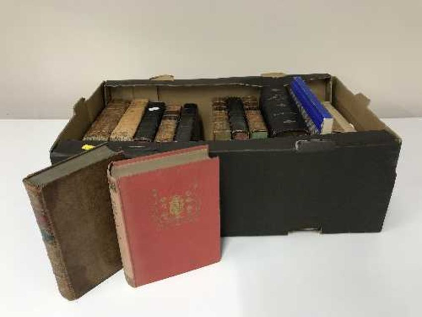 Three boxes of miscellaneous books, antiquarian leather bound volumes etc