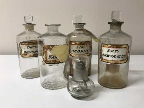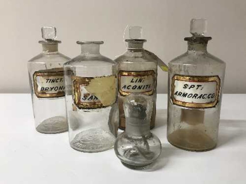 Four antique glass chemist's jars and a small glass paraffin lamp
