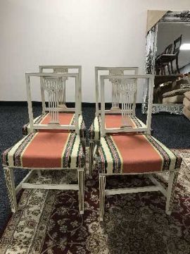 A set of four early 20th century painted dining chairs in striped fabric