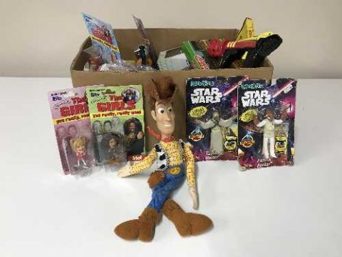 A box containing Star Wars figures, Spice Girls figures, die cast vehicles, toys etc