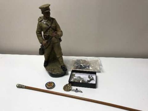 A good collection of militaria - buttons, badges, shell casing caps, swagger stick, five certification cards and a chalk figure of a soldier