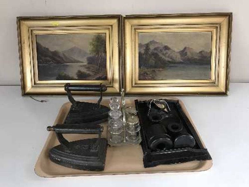 A tray of wooden six piece desk stand, three metal flat irons, cruet set and pair of oils on board by M. G. Bell, dated 1920