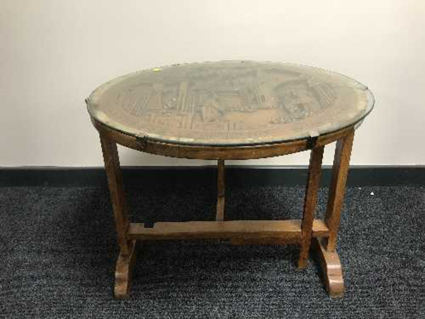 A folding carved oriental hardwood, a Kutani ware sake set, cholkin plate and brass vase
