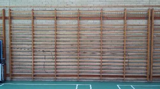 Six gymnasium wooden ladder wall systems comprising of 4 x six-ladder units each approximately 5.05m x 2.60m, and 2 x four-ladder units each approximately 3.4m x 2.6m. This lot is not on view and is sold from the images only, the buyer must be capable of dismantling and removing from the gymnasium site located in NE3 within 10 business days of the fall of the hammer. For further information please contact the auctioneer's office.