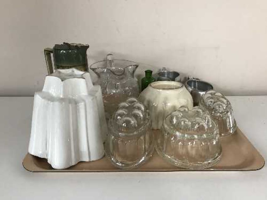 A tray containing vintage glass and pottery jelly molds, Royal Doulton pewter lidded jug, Piquet ware sugar basin and milk jug etc