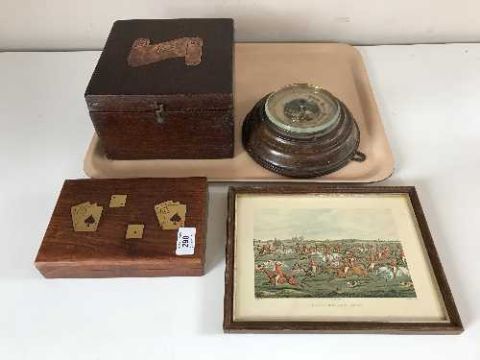 A tray containing a colour print, tally ho, circular oak barometer etc