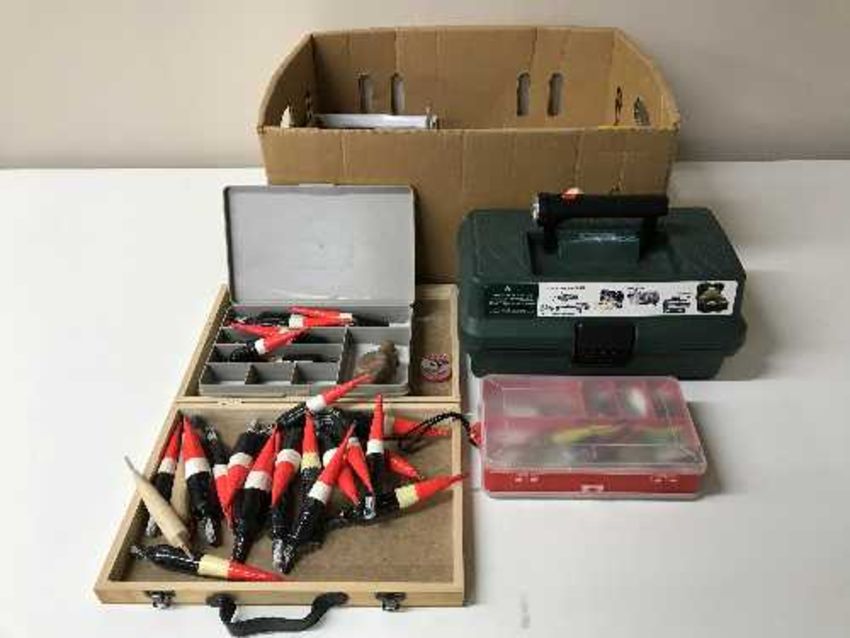 A box of assorted fishing floats, nylon, tackle box, etc