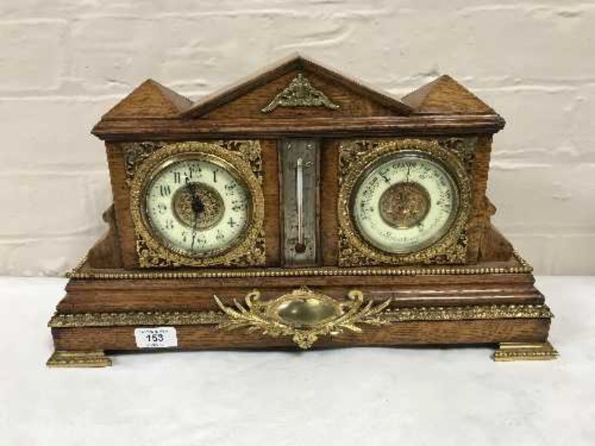An antique oak bracket clock with gilt and enamelled dial, fitted with a barometer, with ormolu mounts