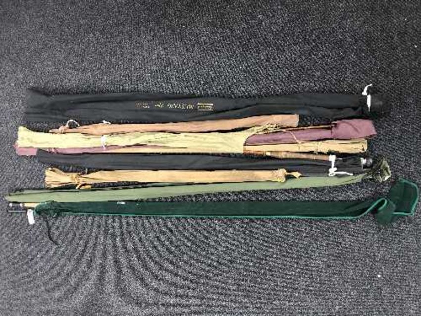 Nine assorted fly rods in carry bags including Leeda, Shakespeare etc, a pair of waders and a landing net