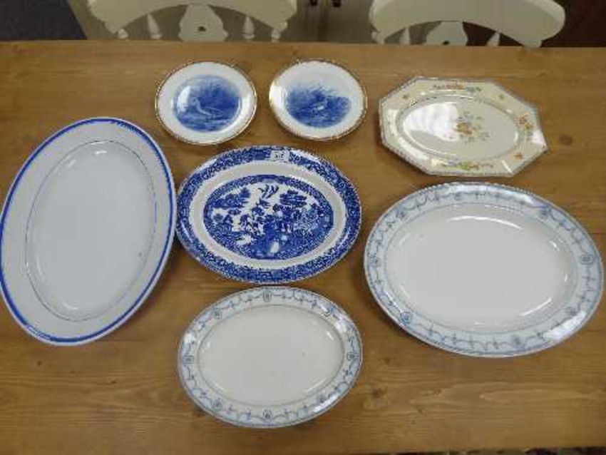 Three Johnson Bros. meat plates, willow pattern plate, two wall plates