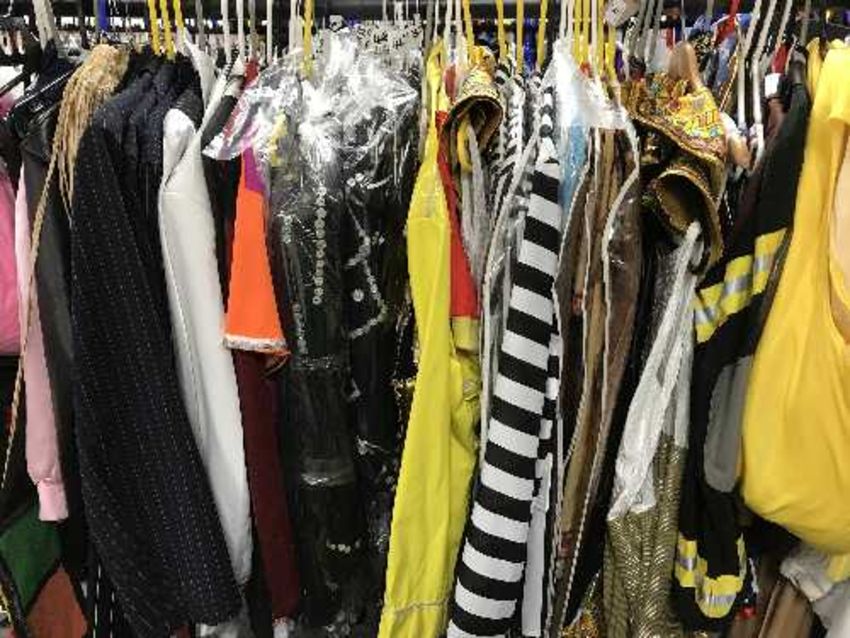 A full rail of pantomime outfits, dress uniforms, dresses etc