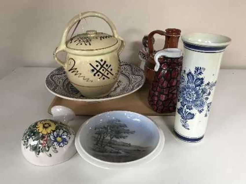 A tray of Delft ware plate, pottery storage jar, vases, etc