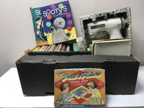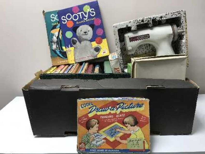 A box of Jones Meccano lockstitch sewing machine together with vintage annuals and games