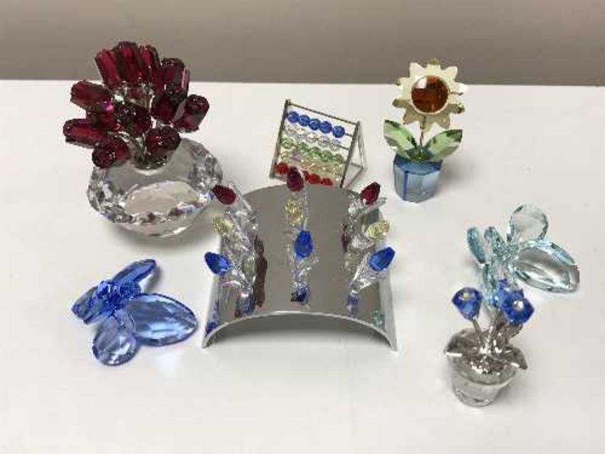 Six Swarovski crystal ornaments - Three flowers in vases, two butterflies and an Abbacus, together with a further stand containing nine Swarovski crystal flowers