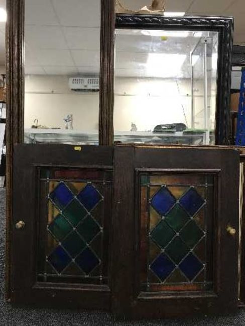 Two framed mirrors, two stained glass panel doors together with two antiquarian prints