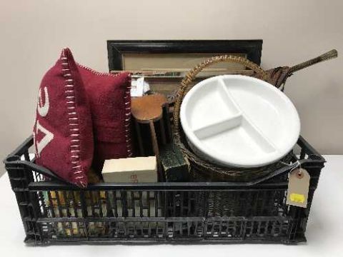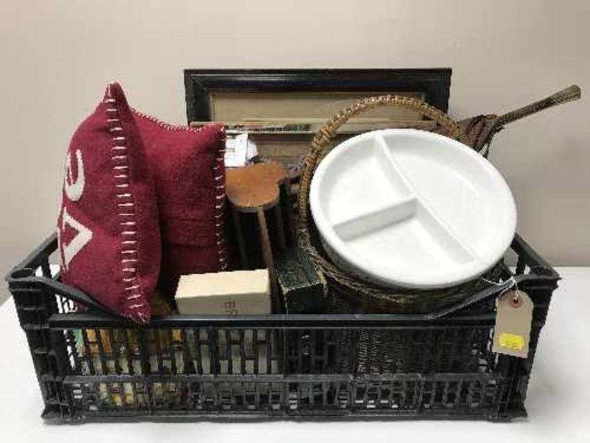A box of various collectables, wooden letter rack, picture frame lights, wicker shopping basket, small set of oak bookshelves, milking stool etc