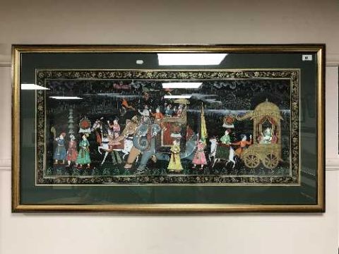 Mughal School : A colourful pageant of figures and a carriage, watercolour, 45 cm x 102 cm, framed.