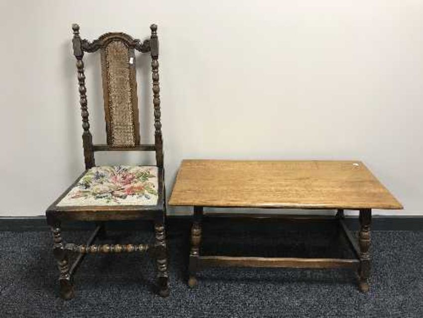 An antique turned oak bergere hall chair together with a rectangular oak coffee table