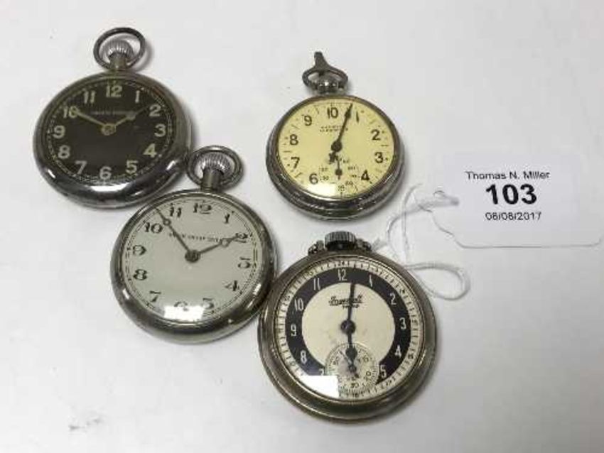 An Ingersol pocket watch, two other watches markes Shock Proof and a pedometer