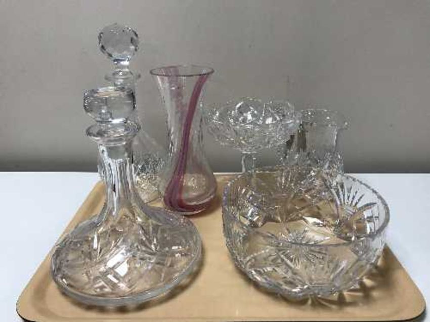 A tray containing lead crystal including a Royal Doulton water jug, a Royal Brierley crystal fruit bowl, ship's decanter, comport etc.