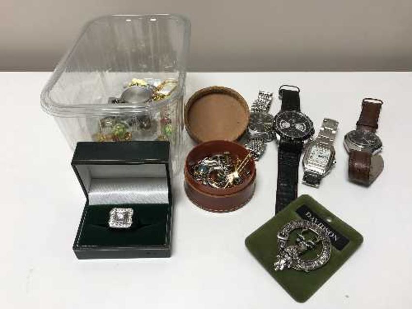 A box of wrist watches, Accurist, Seiko together with costume jewellery, silver chain etc