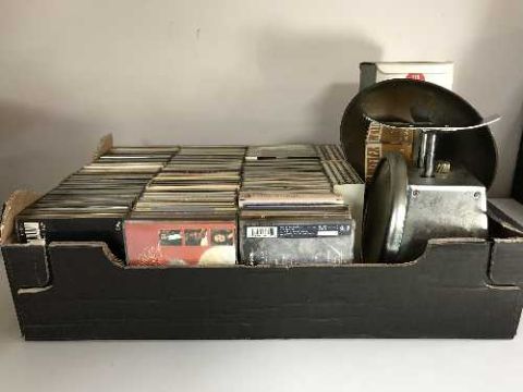A box of Cds, camera accessories, scales & weights, Dyson DC 25 vac cleaner