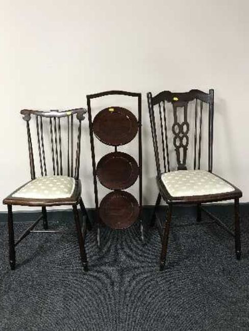 A mahogany folding cake stand and two Victorian bedroom chairs
