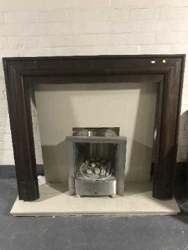 A chrome gas fire insert with marble hearth and back together with a mahogany fire surround