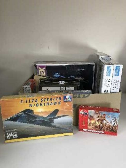 A box of plastic model kits - Star Trek Klingon Cruiser, air craft, AirFix British Infantry etc