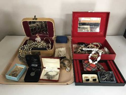 A tray of jewellery boxes of costume jewellery, 9ct gold earrings, watches etc