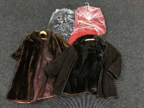 A 1980's red leather skirt suit, Barbour jacket, faux fur coat