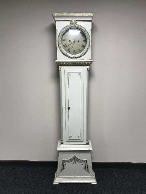 A continental white and gilt painted long cased clock with pendulum and weights
